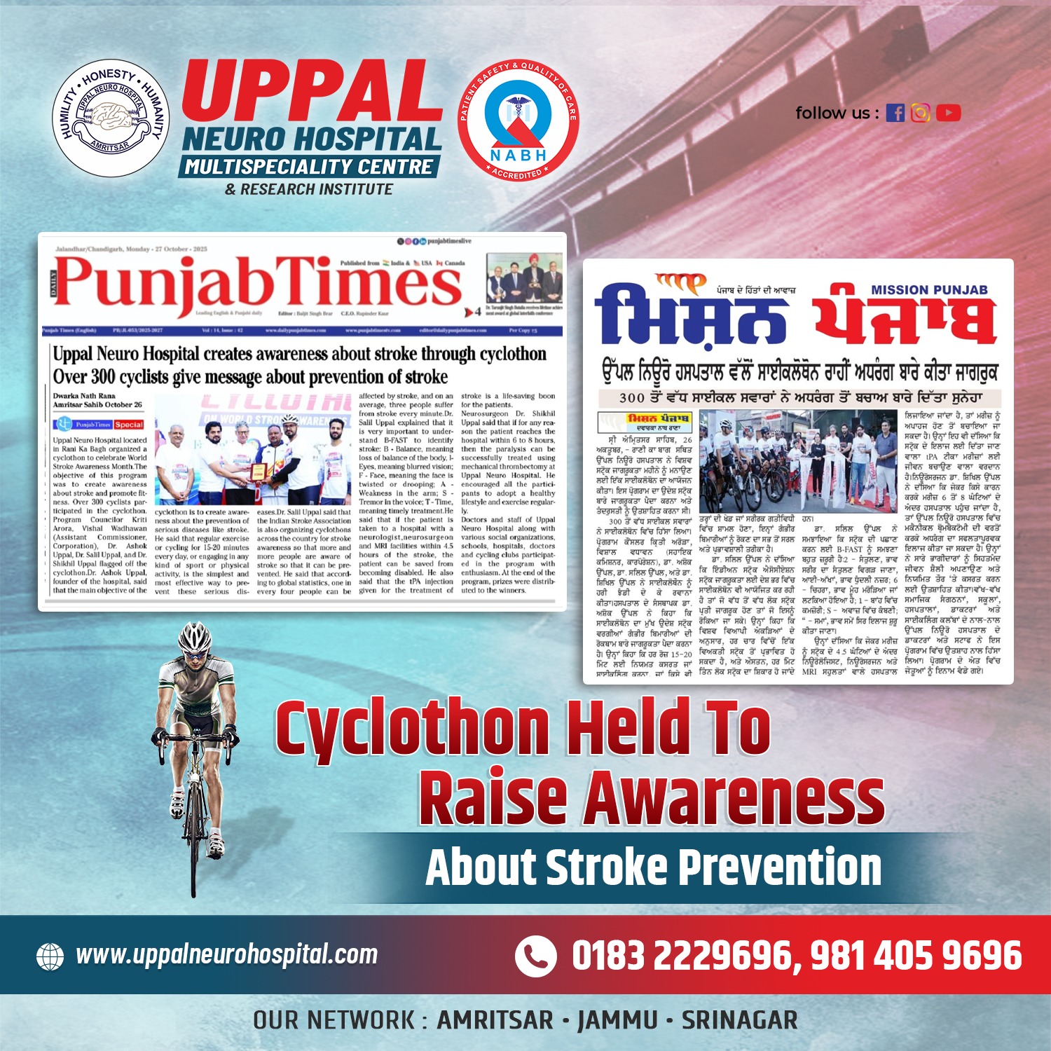 With a mission to build a healthier and more aware community, Uppal Neuro Hospital, Amritsar organised Cyclothon 2025 to mark World Stroke Awareness Month. Over 300 cyclists joined the movement to spread awareness that stroke is preventable and treatable. The event was flagged off by Dr. Ashok Uppal, Dr. Salil, Dr. Shikhil Uppal and other dignitaries of the hospital.